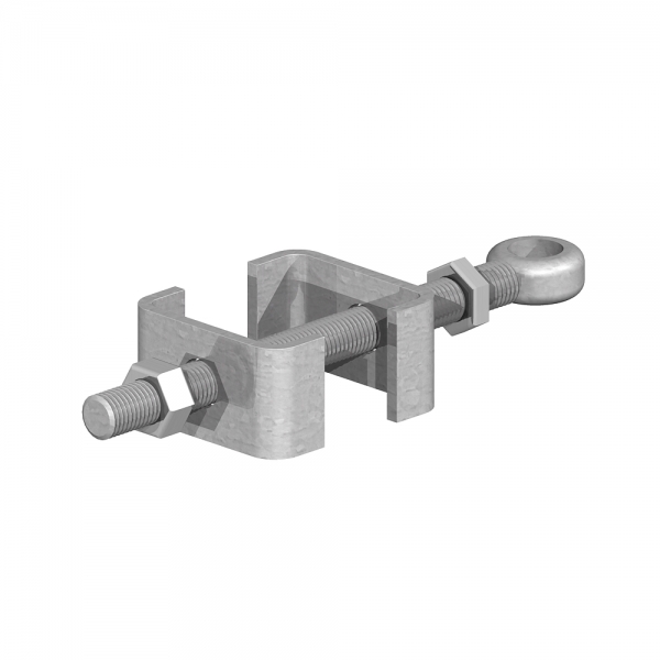Adjustable Bottom Gate Fitting, used for the hanging and fitting of field gates. It consists of an adjustable gate eye and heel clips, allowing for easy adjustment of the levels of the gate when fitted. This is fitted by drilling a single hole in the closing stile, tightening up the nuts onto the heel clips either side of the stile clamping together tight.