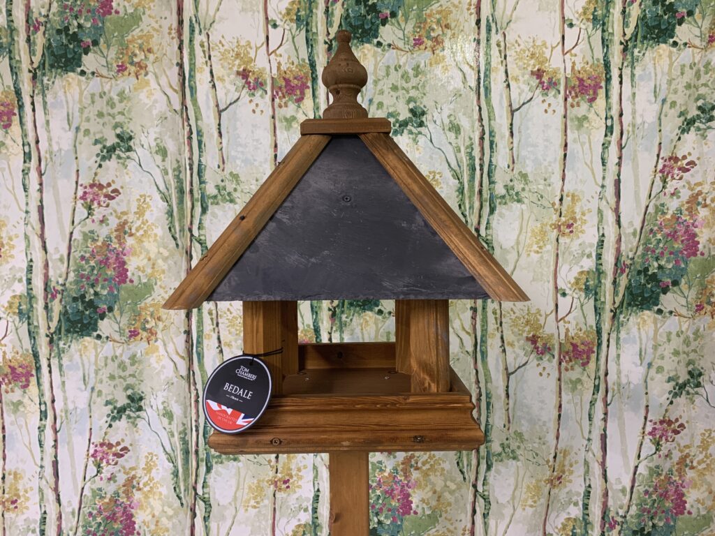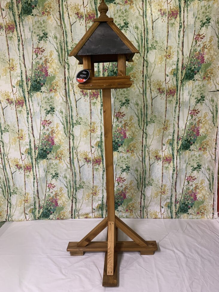 The Bedale Bird Table is handcrafted from Swedish redwood with a slate roof. It also features a softly shaped tray and carved finial on top.