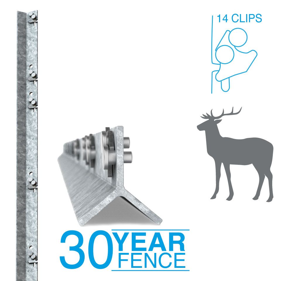 The Clipex Deer Standard post is a 3.0m long 14 clip post, designed specifically for all X fence 13/190 deer or boar fence patterns with one line of barbed, plain or electric above. All 13 line wires are clipped to the post to provide real strength and defend against any attention deer or boar may give the fenceline.