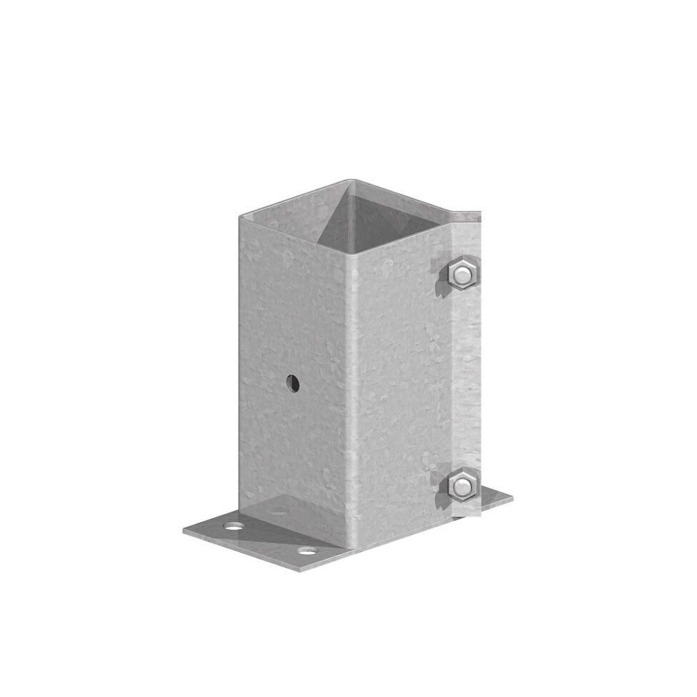 Post support on a rectangular plate, ideal for the edge of a path. The post is clamped into the socket with 2 bolts for security.