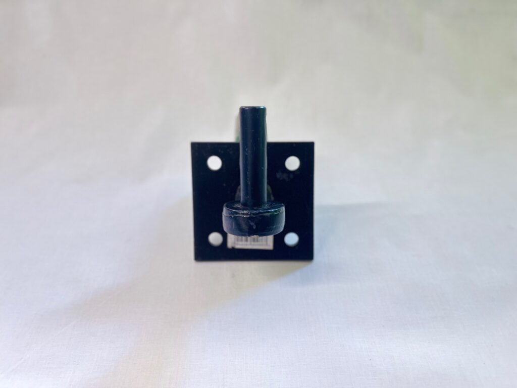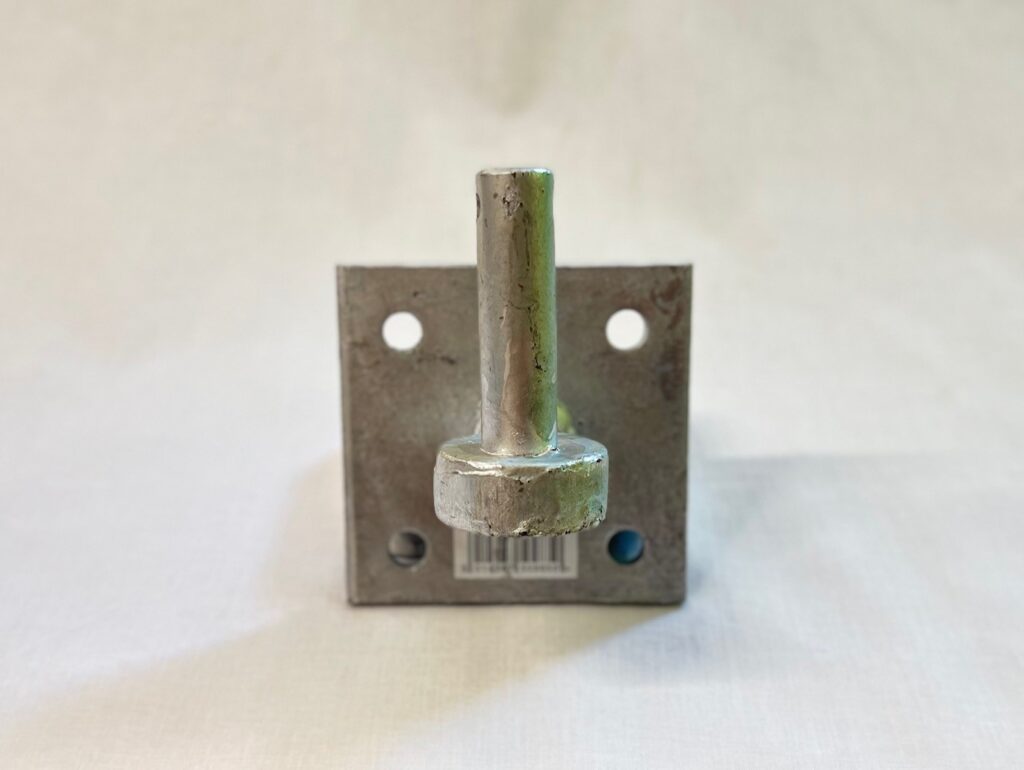 When it’s fixed, it’s 2″ from the centre of the pin to the plate. The hook’s adjustable length is 2 1/4″ – 3 3/4″, from the centre of the pin to the plate.