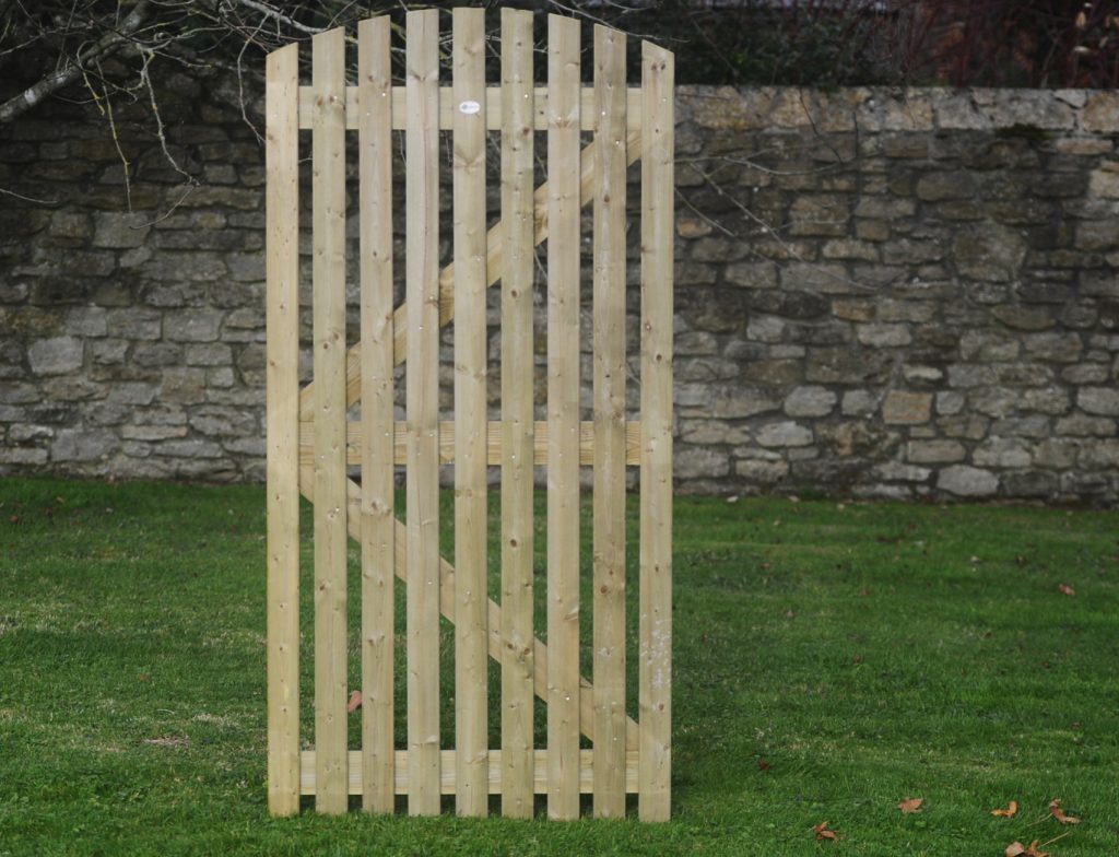 Our Orchard Gate is a ledged and braced slatted gate with a curved top and planed finish.