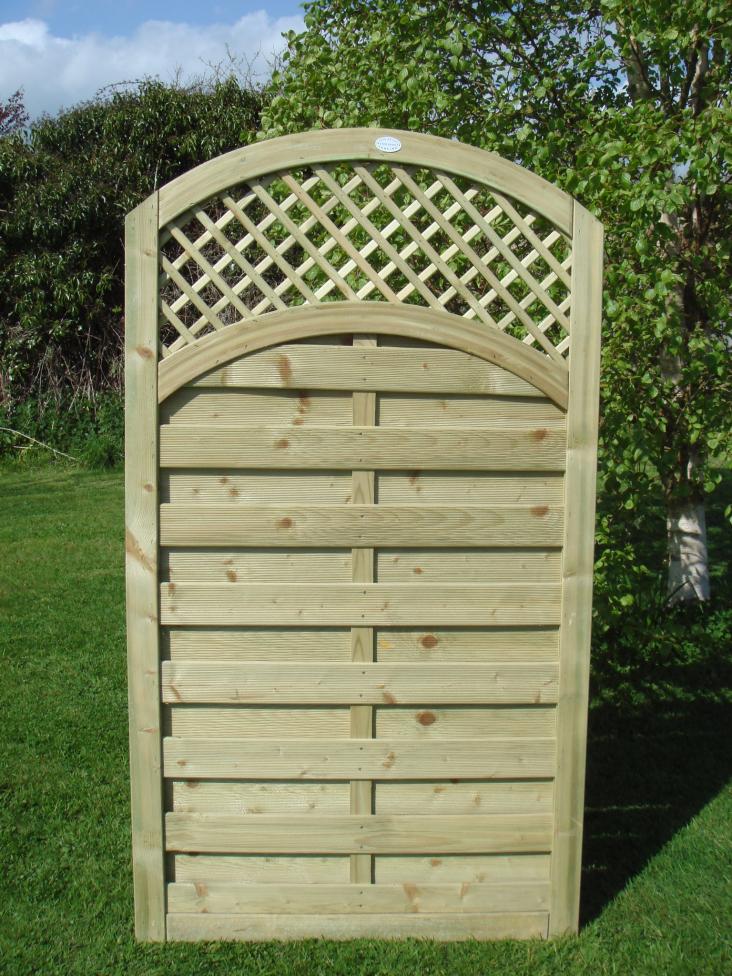 Pilsdon Gate is a decorative gate with a slatted base and a curved trellis top. This gate matches the Pilsdon Panels.