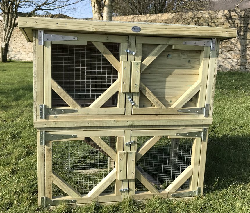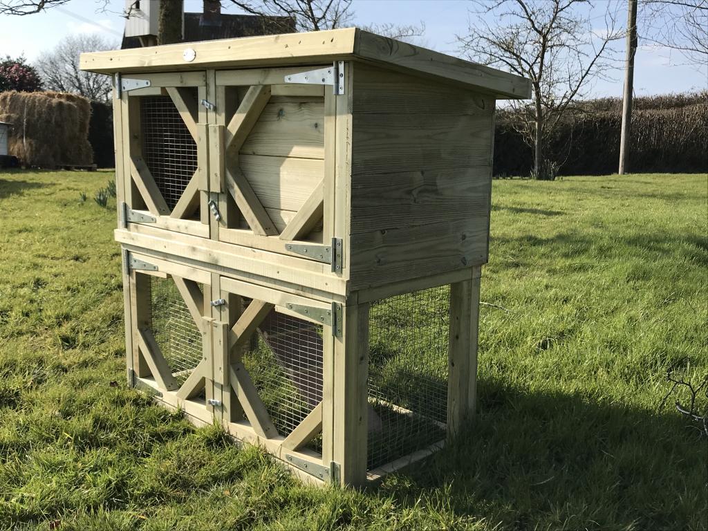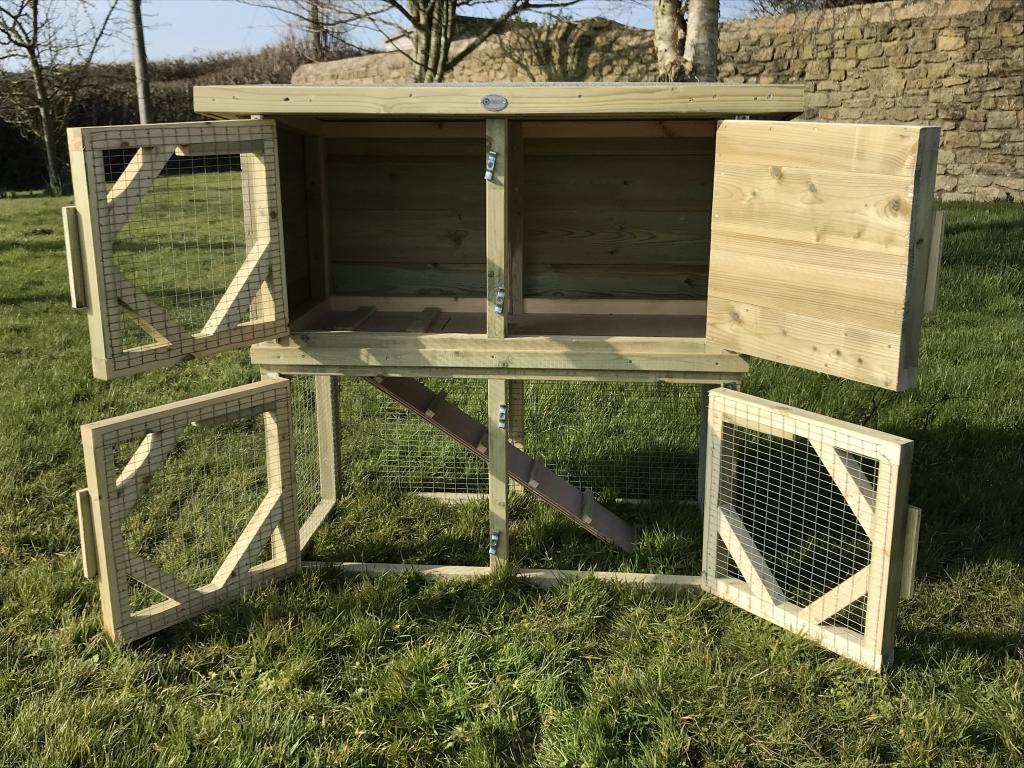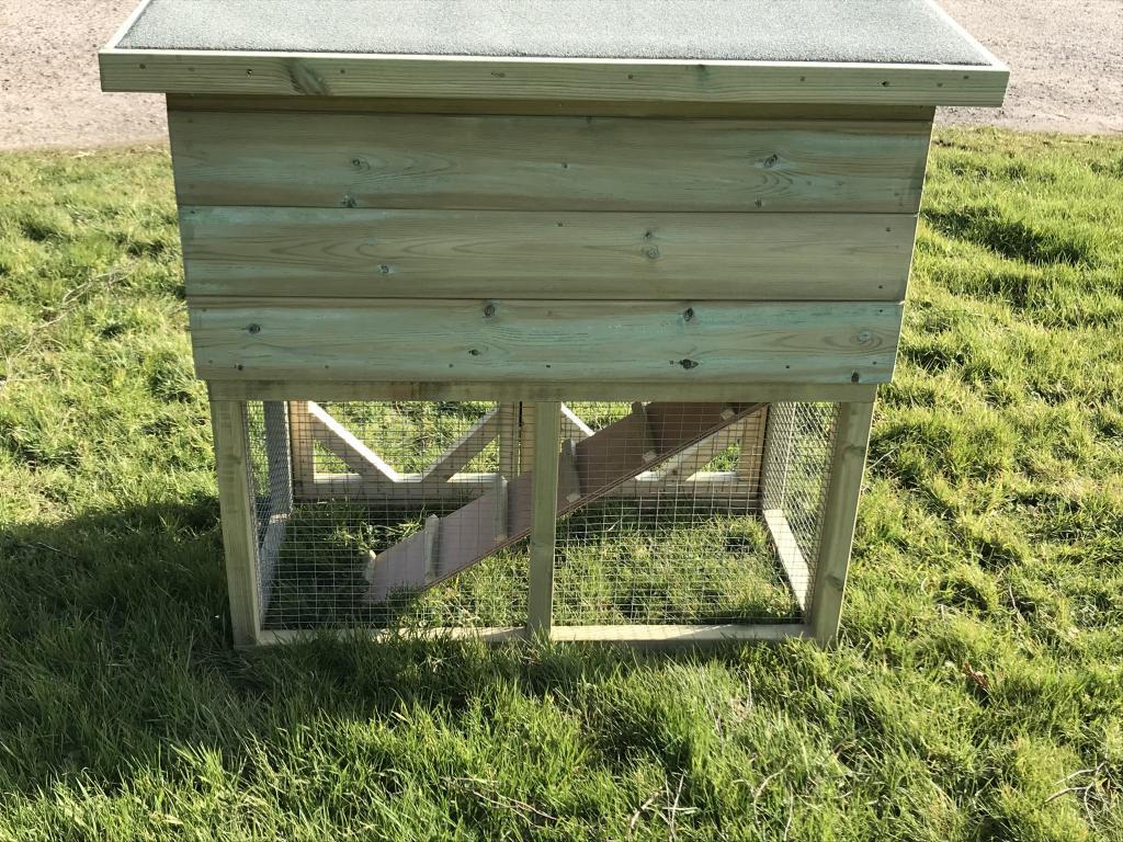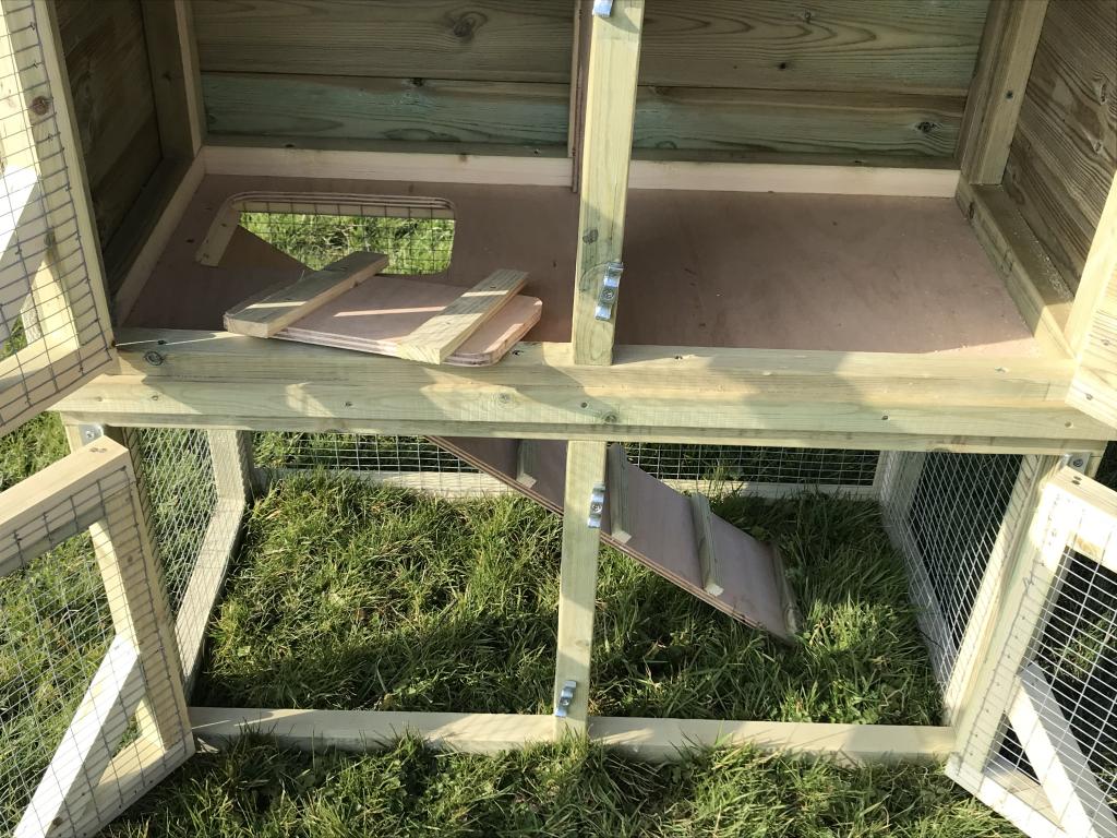Rabbit hutch with a run underneath with a ramp between the top house and bottom run, including a cover to block off access to the run if needed.