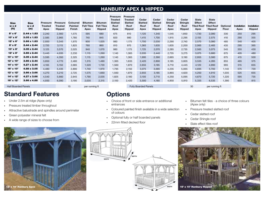 The Hanbury is available in a multitude of sizes, and two different roofing styles (hipped or apex). Optional extras are also available for you to tailor the summerhouse to fit your space.